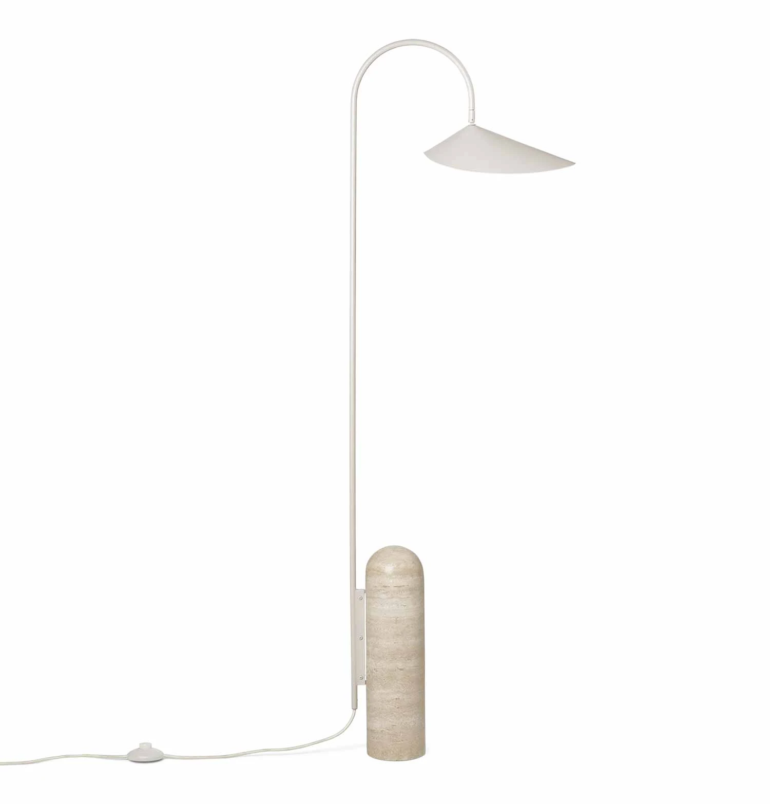 The Arum Floor Lamp is characterised by the black solid marble base combined with the organically shaped lampshade. Achieving the perfect balance in the off-centre structure of the lamp, the black marble foot counterweighs the gentle way the lampshade is suspended from the curved metal arch in a leaf-like manner. With the matte, off-white inside of the shade, the lamp provides a soft, evenly distributed light, and the lampshade can be adjusted to ensure optimal light conditions in all situations.