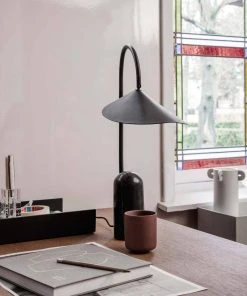 The Arum Table Lamp is characterised by the black solid marble base combined with the organically shaped lampshade. Achieving the perfect balance in the off-centre structure of the lamp, the black marble foot counterweighs the gentle way the lampshade is suspended from the curved metal arch in a leaf-like manner. With the matte, off-white inside of the shade, the lamp provides a soft, evenly distributed light, and the lampshade can be adjusted to ensure optimal light conditions in all situations.