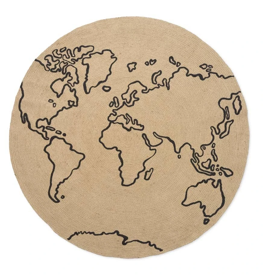 Woven in natural jute, this circular rug is decorated with a printed world map. The natural tones of this durable, sustainable material ensures that it fits into any home. Place it in the centre of a childβs bedroom for use as a play mat or next to their bed to keep small toes warm in the morning.