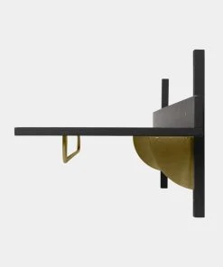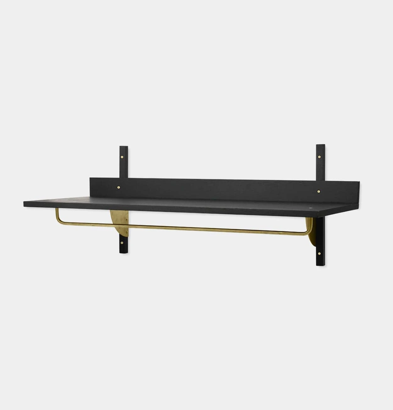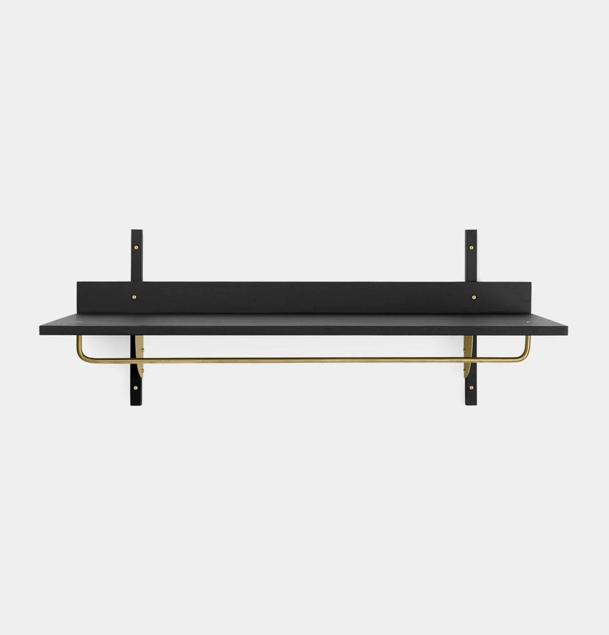- Material: Shelf: Black stained ash veneer with MDF core. Profiles: Black stained solid ash. Brackets: Brass