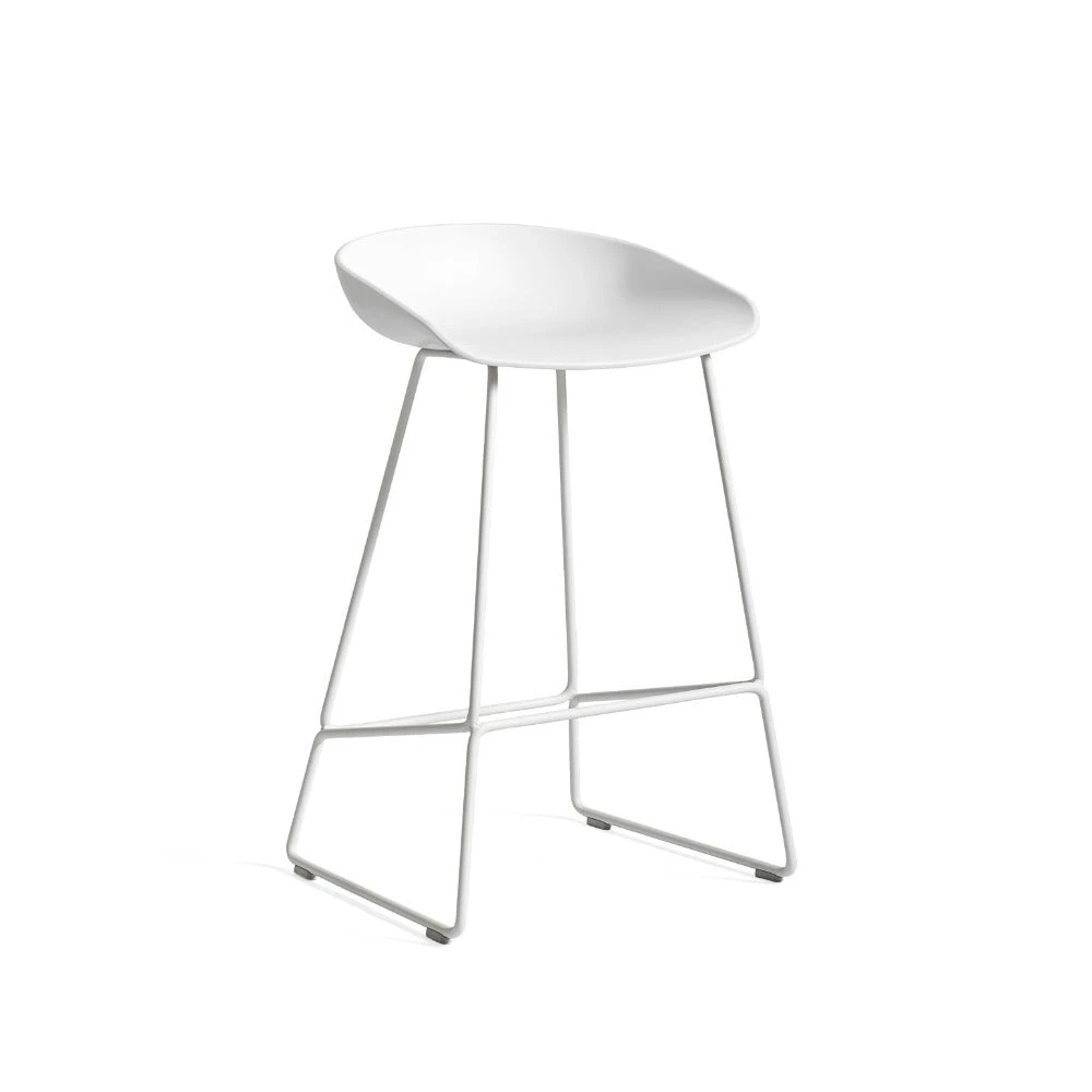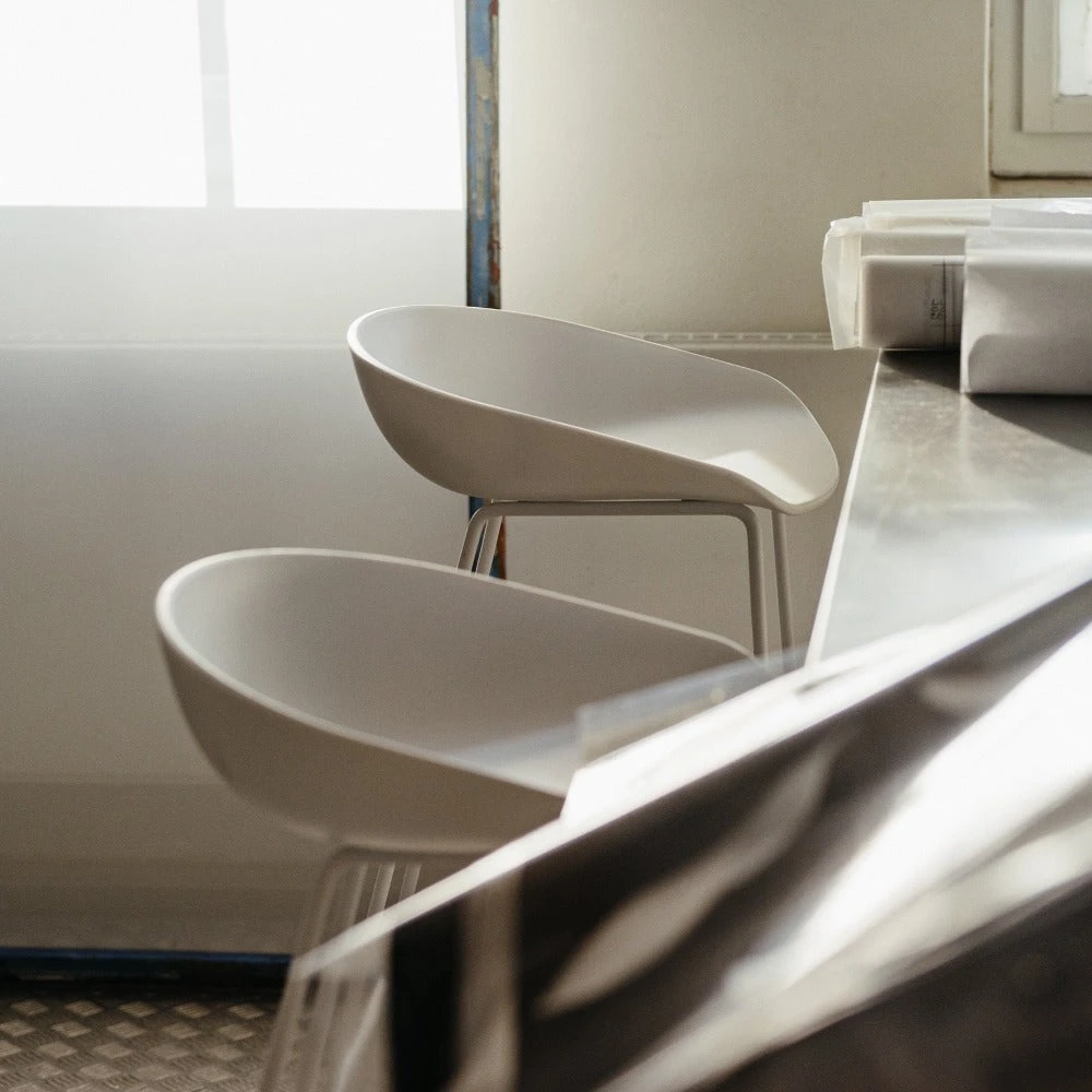 A curvy comfy polypropylene seat on top of an elegant rounded frame in powder coated metal, with a more industrial design than the wooden counterpart. Ideal for informal dining at kitchen countertops.