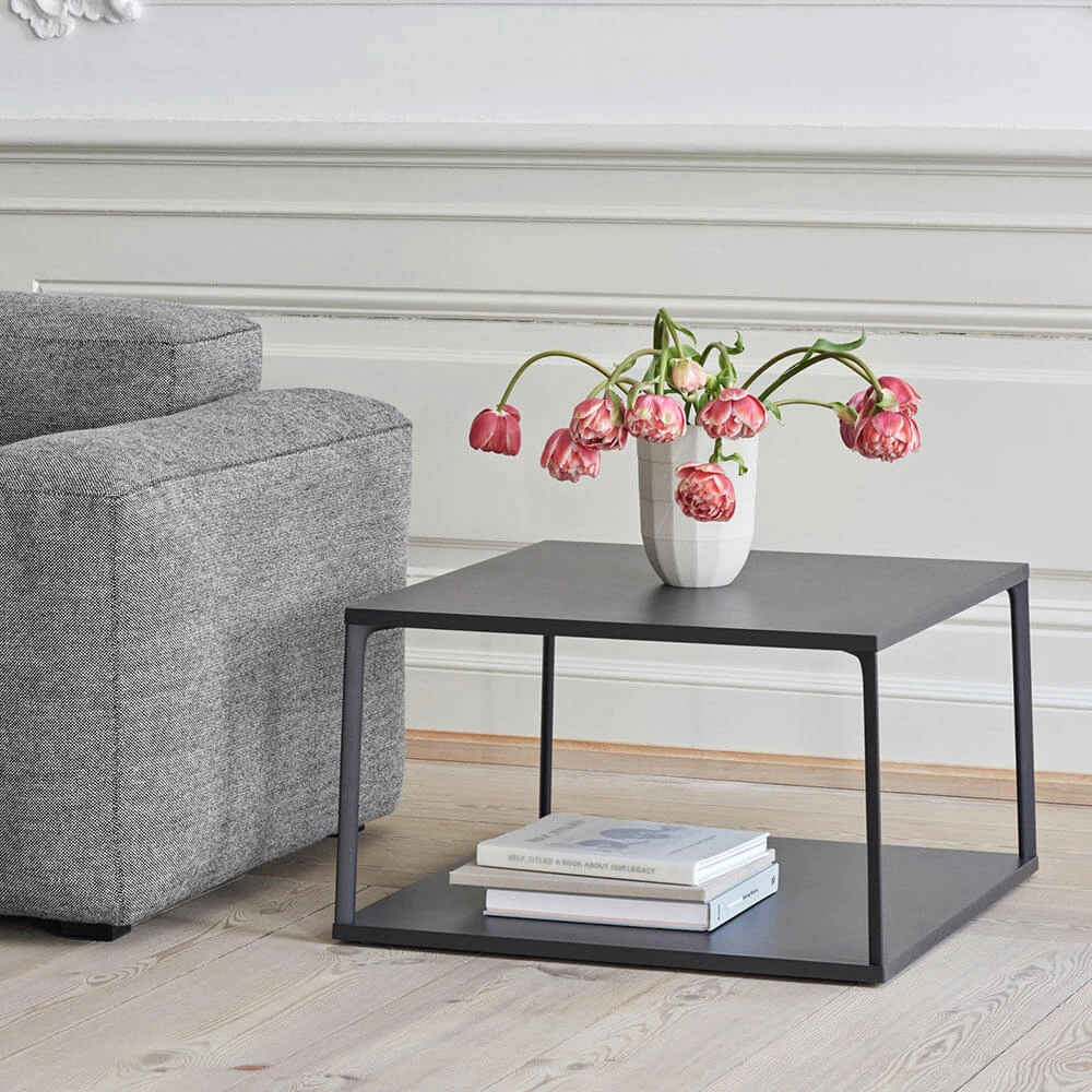 Cast aluminium legs with powder-coated MDF shelves in ink black.Â