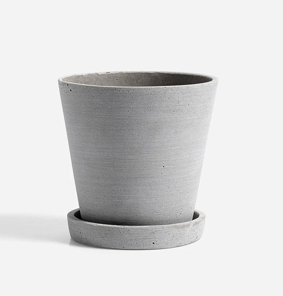 A minimalist HAY plant pot with saucer made from polystone – a cross between stone and plastic which gives a rough, organic finish similar to concrete.