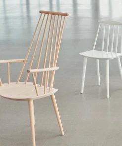 With the comfort of a lounge chair and the functionality of a dining chair, HAYβs reproduction of Poul M. Voulterβs J110 offers equal measures of strong aesthetics and practicality. Long rods at the back and curved armrests create an inviting expression. Made in lacquered solid beech and available in a variety of colours.