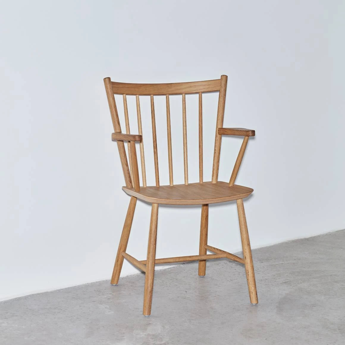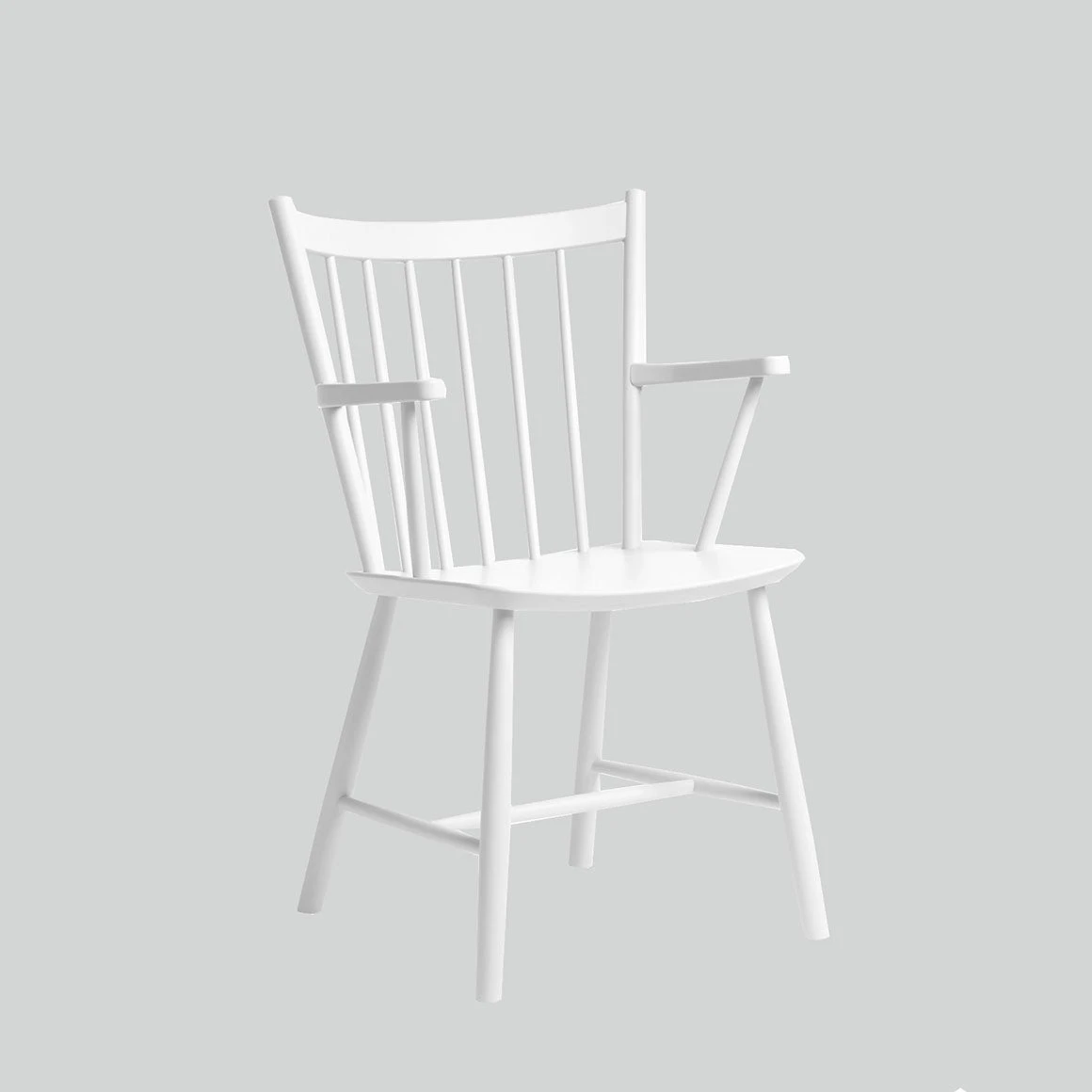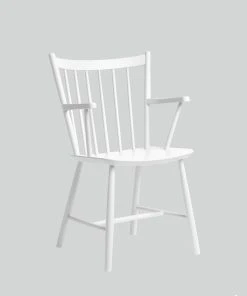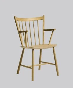 The J42 chair has simple horizontal and vertical lines which are used to construct a curved spindled backrest and angular armrests.
