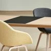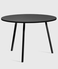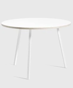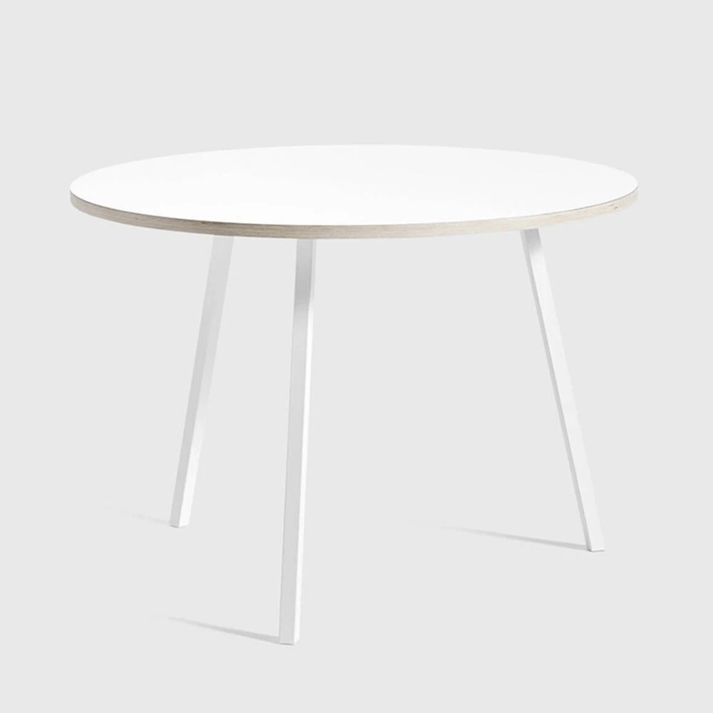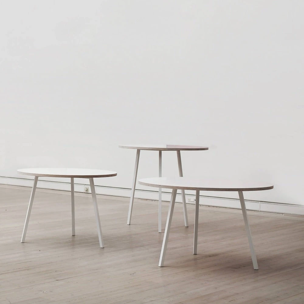 The laminated plywood top sits on three angled legs. The white version has an exposed plywood edge to the tabletop. The black version has a black stained ash veneer edge.Â