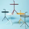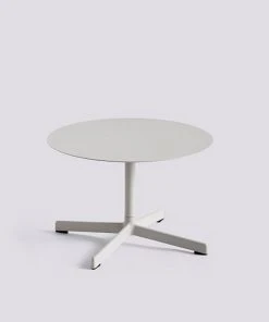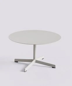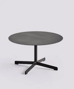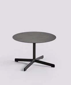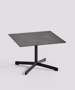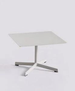 The Neu Low Table features a small round or square tabletop attached to a short central pole and angled 4-star pedestal base.