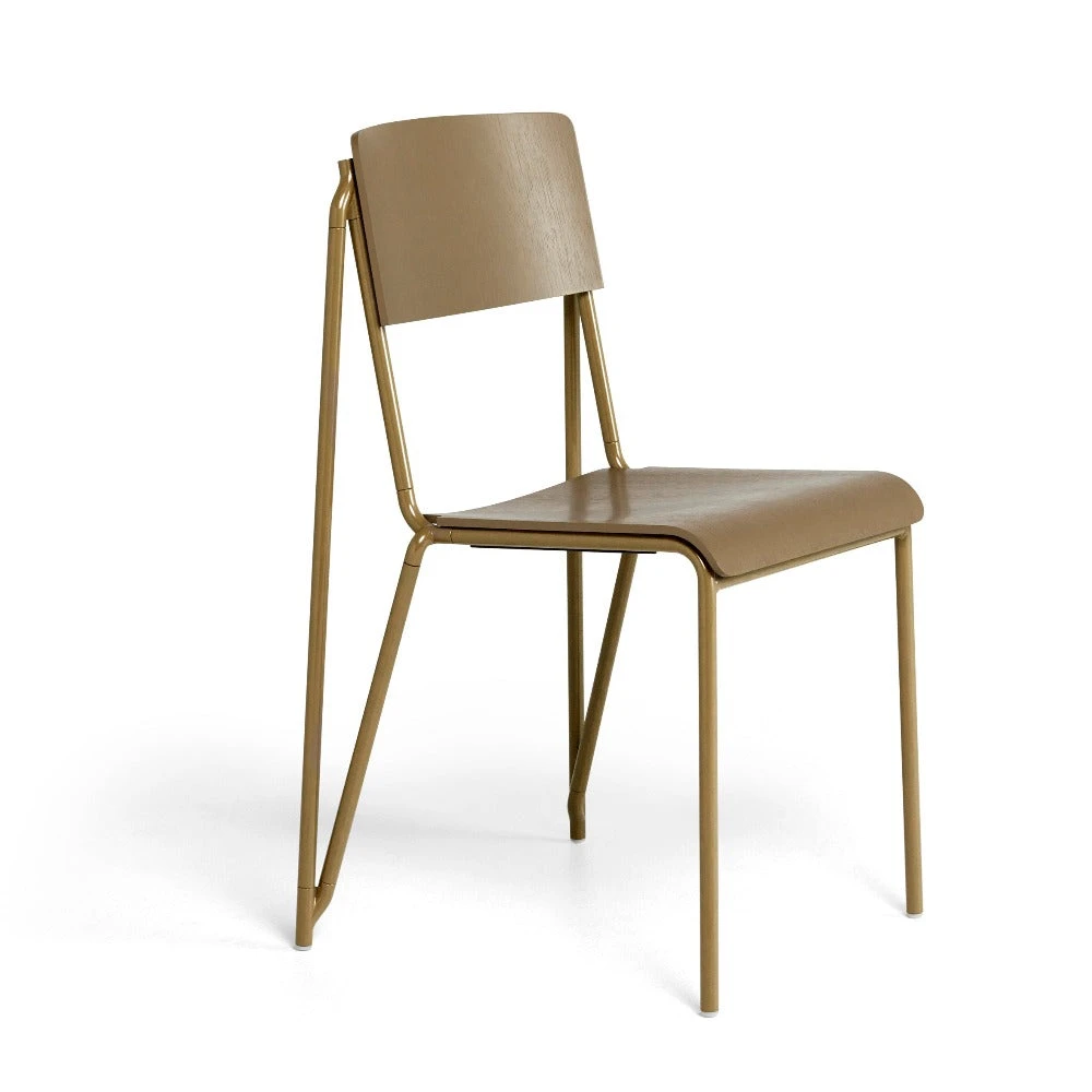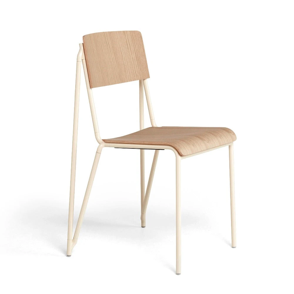 Using die-cast aluminium and steel tubes that connect into a three-dimensional triangle, the lightweight frame has a distinctively geometric silhouette, which is counterbalanced by the warmth and natural quality of the oak-veneer seat and backrest.Â