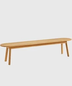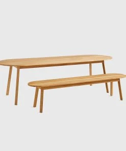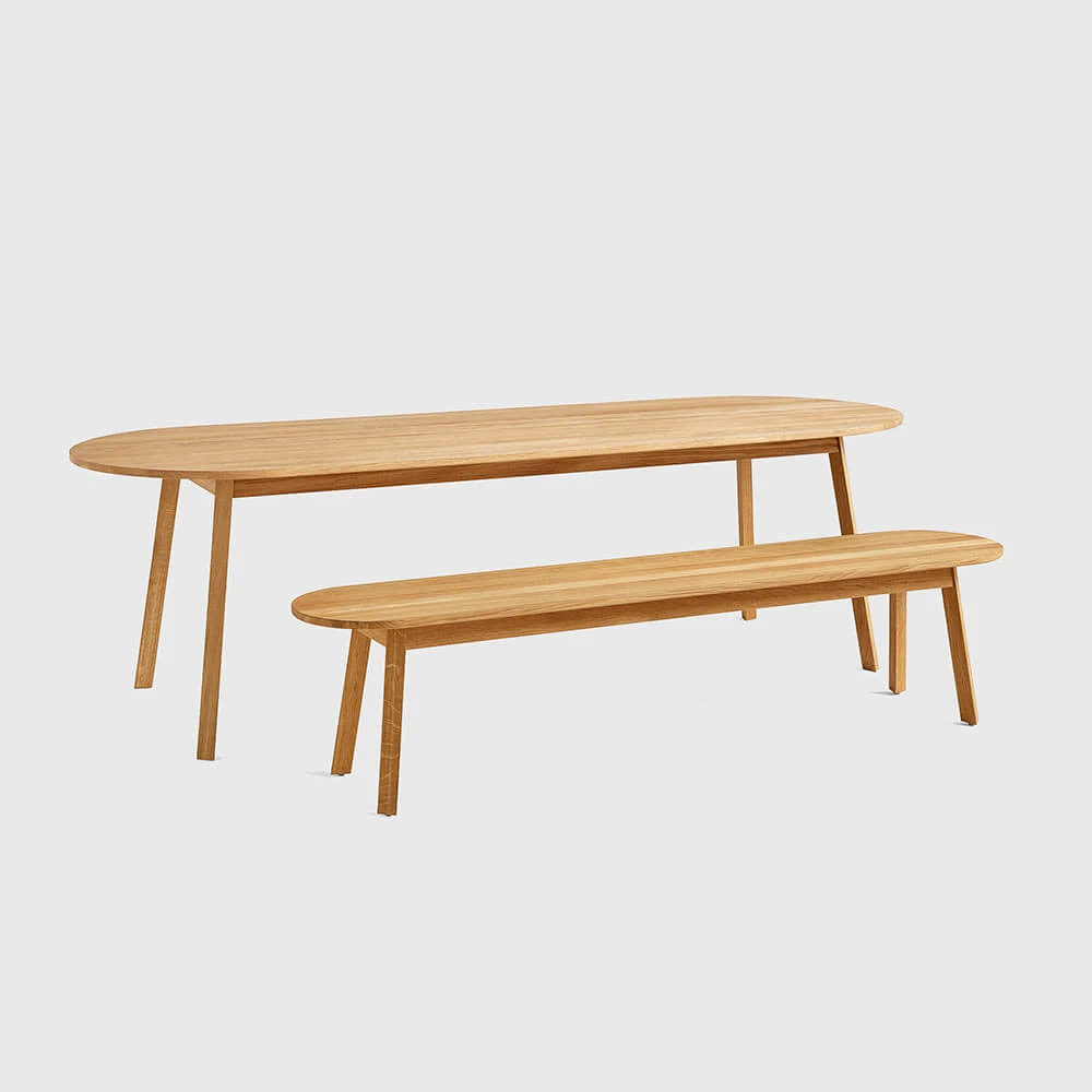 The rectangular ends of the tabletop and bench have been rounded, creating a sociable setting that maximises seating numbers around the table.
